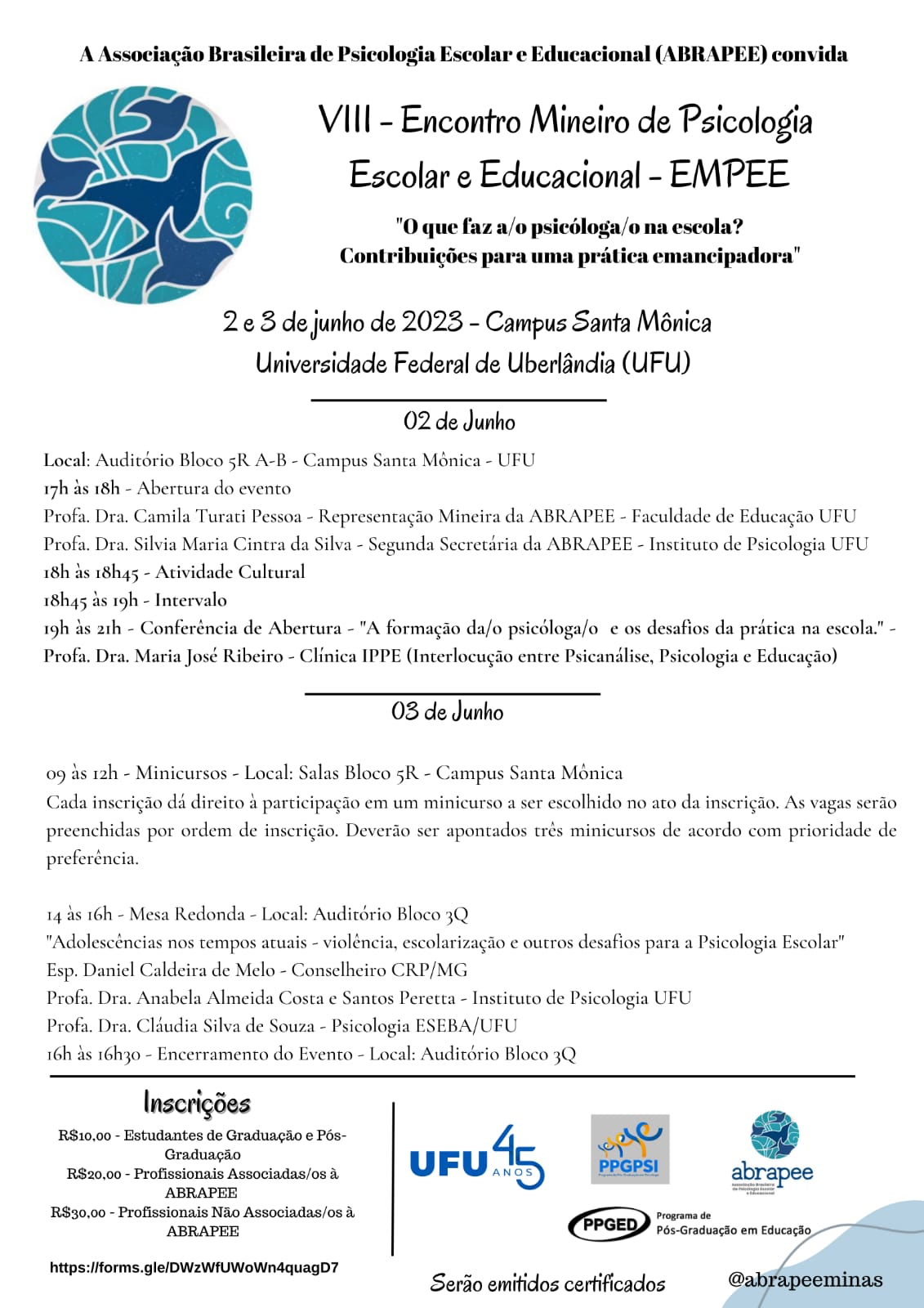 A Representação Mineira da Associação Brasileira de Psicologia Escola e Educacional (ABRAPEE) realizará o VIII Encontro Mineiro de Psicologia Escolar e Educacional nos dias 02 e 03 de Junho de 2023 no Campus Santa Mônica da Universidade Federal de Uberlândia.